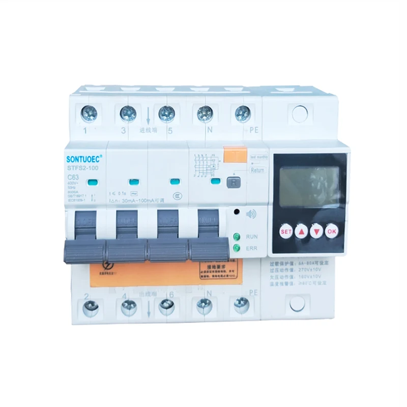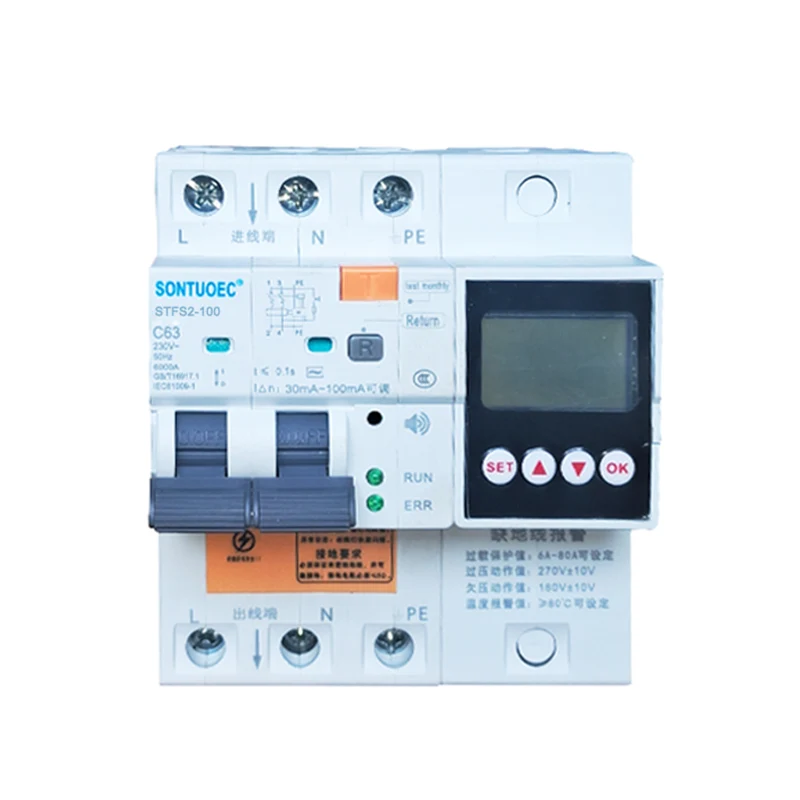 STSF2-100 100A 2P 4P RCBO đa chức năng phù hợp với AC 50/60Hz, được định mức trong một mạch có điện áp 230V-400V và dòng điện được định mức 100A, khi Aperson bị điện giật hoặc rò rỉ lưới điện. Khi rò rỉ, quá điện áp và quá điện áp đạt đến các giá trị đã đặt, bộ ngắt mạch dòng còn lại có thể nhanh chóng hoạt động trong một khoảng thời gian rất ngắn nhanh chóng cắt nguồn cung cấp điện. Khi nhiệt độ giám sát của bộ ngắt mạch hiện tại còn lại đạt đến giá trị đã đặt, dây nối tiếp không được kết nối. Khi được kết nối, sản phẩm phát ra âm thanh báo động để bảo vệ sự an toàn của nhân sự và thiết bị điện, và có thể tránh Ngăn chặn thiệt hại cho thiết bị gây ra bởi quá điện áp trong lưới điện. Có quá tải, ngắn mạch, rò rỉ, quá điện áp và các chức năng bảo vệ quá nhiệt cũng có thể được sử dụng để bật và tắt các thiết bị điện trong trường hợp bình thường Mạch chiếu sáng, đặc biệt phù hợp cho các hệ thống phân phối chiếu sáng công nghiệp và thương mại. Sản phẩm có khối lượng nhỏ, cấu trúc nhỏ gọn và hiệu quả chi phí tốt hơn so với các sản phẩm tương tự khác. Nó có một vẻ ngoài đẹp, Khả năng phá vỡ cao làm cho nó là một lựa chọn tốt cho phân phối điện gia đình. Sản phẩm này tuân thủ các tiêu chuẩn GB/T 16917.1 và IEC 61009-1 và đã có được chứng nhận CE.